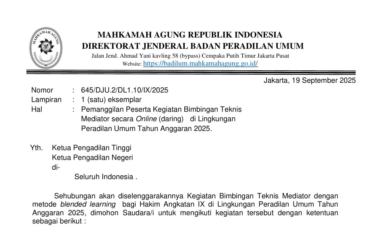 Badan Peradilan Umum (Badilum) Mahkamah Agung RI resmi mengumumkan pemanggilan peserta kegiatan Bimbingan Teknis (Bimtek) Mediator secara daring bagi hakim Angkatan IX di lingkungan Peradilan Umum Tahun Anggaran 2025,  Rabu, 24 September 2025.