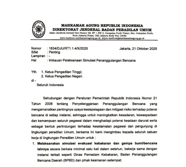 Direktorat Jenderal Badan Peradilan Umum (Ditjen Badilum) menghimbau kepada Ketua Pengadilan Tinggi (KPT) dan Ketua Pengadilan Negeri (KPN) untuk melaksanakan simulasi penanggulangan bencana sebagaimana surat edaran Nomor 1834/DJU/RT.1.1.4/X/2025 pada hari Selasa (21/10/2025).